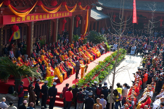 是日艳阳高照,万里无云,青山环抱下的四祖寺春意盎然,白玉兰花开满树,杨柳枝吐露新芽。大雄宝殿广场前,四祖道信大师亲手种植的1400余岁祥云柏遒劲葱郁,直插云宵,各处店堂及台阶栏杆披红挂彩,灿若云霞。十方海众云集,从各级政府领导到专家学者,从十方善信到诸山长老,从两岸四地代表到东南亚、欧美等国嘉宾,近万人齐聚一堂,见证历史,共襄盛会。