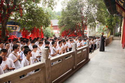 用过午斋,全体营员乘车前往五祖寺。五祖寺位于黄梅县东12公里的东山,是禅宗五祖弘忍大师说法道场,也是六祖慧能大师得衣之地,在国内外享有盛名。下车后,营员依次排队进入。崇谛师带领大家在大雄宝殿前三问讯及诵《心经》,随后解散分组参访。五祖寺内风景优美,殿宇僧舍皆为绿树翠竹所遮掩,彼此有重门相通,小路相连,是典型的廊院式布局,极富园林情趣,有“曲径通幽处,禅房花木深”的意境。营员参访朝拜了天王殿、大雄宝殿、麻城殿、真身殿、圣母殿、观音殿、大满禅师塔、讲经台、授法洞等,部分营员还游览了风光秀丽的后山。下午转晴,天气炎热,有的营员汗流浃背,但仍兴致不减。