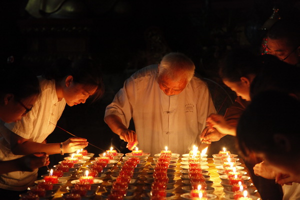 在莲灯重重的火光下,明基大和尚就传灯作了简短的开示,“灯代表着智慧,我们将莲灯供奉到四祖殿,将会开启智慧之光。”